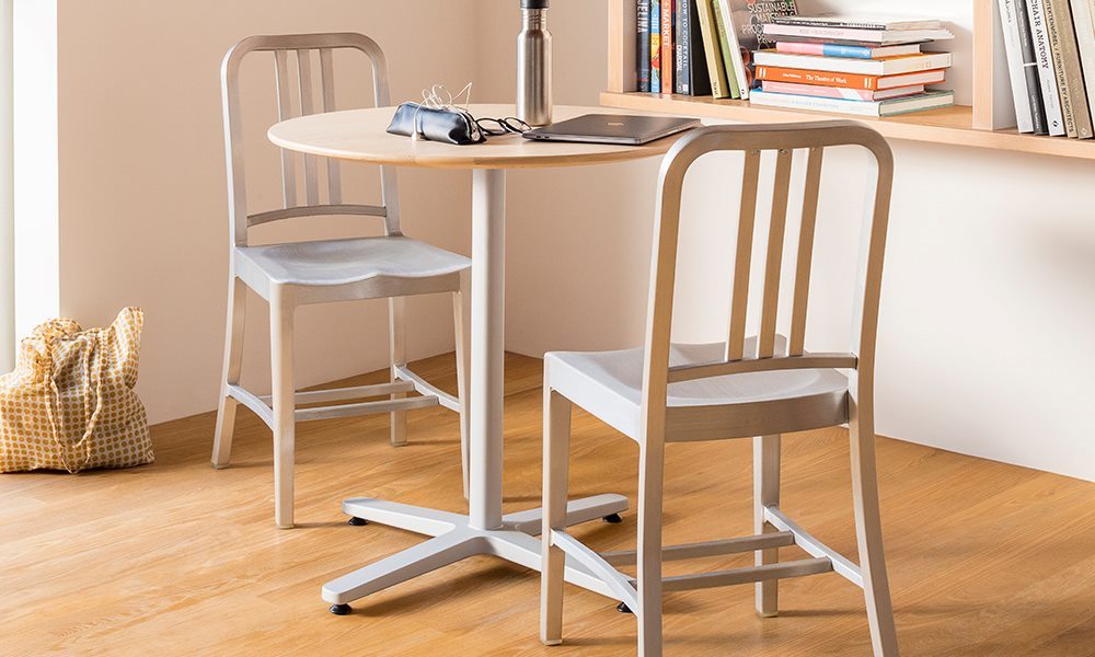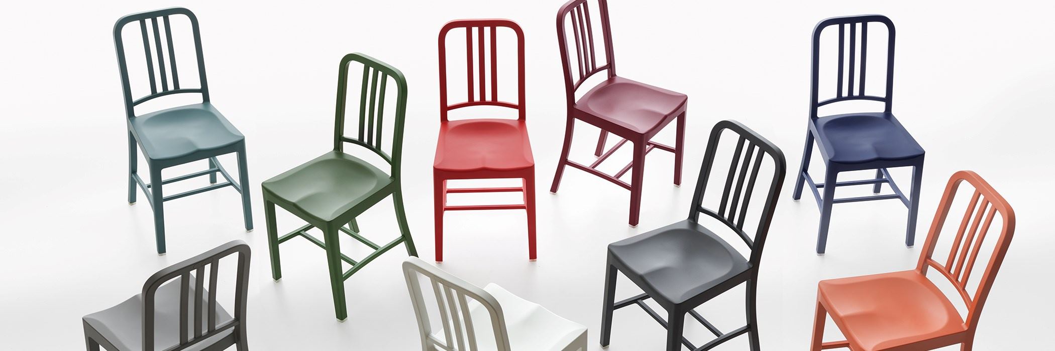 由 Wilton Carlyle Dinges 創立於 1944 年的美國設計家具品牌 Emeco,在二次大戰期間接受美國海軍的委任,與美鋁公司(ALCOA)共同開發一款適於航海的單椅,以供美國海軍潛艦使用。當時的設計團隊包括了美鋁的科學家及工程師,利用輕巧、堅固而不會生鏽的鋁合金材質,研發出可以抵擋海上惡劣環境的 Navy Chair 系列,獨家手工製作程序,也成為日後 Emeco 的招牌。每一張 Navy Chair 至少須經過 77 道嚴謹的手工製作程序,從切割、彎曲成型、焊接、到拋光打磨,整張椅子由鋁片彎曲交接而成,猶如將未經琢磨的骨架轉變為雕刻傑作的過程。此外,Emeco 的綠色經營概念,更以 80% 的回收鋁作為原料,為地球盡一份善用資源的心力。