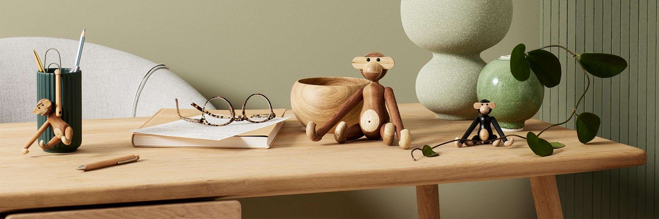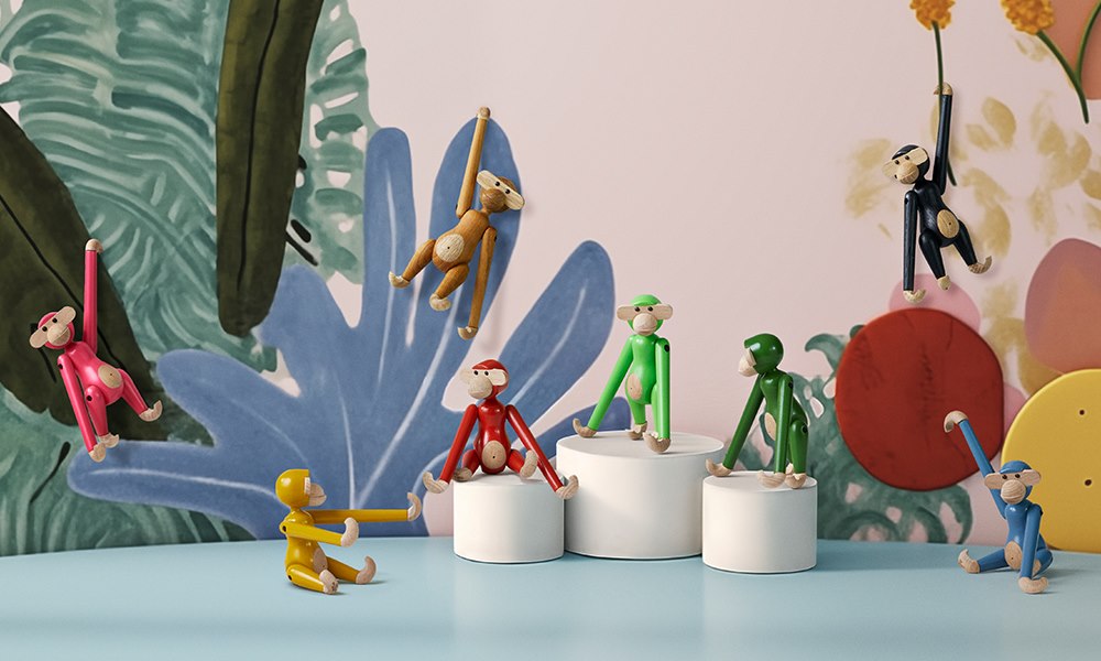 Kay Bojesen 最初以銀器工匠出身,曾在 Georg Jensen 擔任學徒,1910 年學成後創立了名為 Den Permanente 的銀器公司,產品以發揚丹麥設計的功能性特色為主。到了 1930 年代,他開始對木頭感到強烈的興趣,1932 年時以自己名字開設了店面及工作室,並陸續發展成一系列木質動物玩具:臘腸狗、斑馬、搖木馬、以及 1951 年完成的最著名的「木頭小猴」。