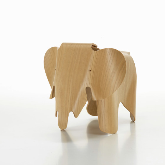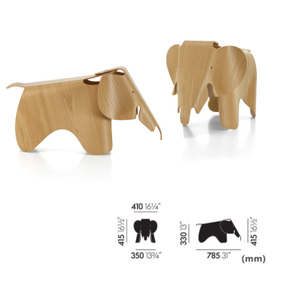 在加工技術不甚成熟的40年代,夫妻倆苦心鑽研多年才成功的 Plywood 彎曲技術,首件作品便選擇了他們最愛的精神動物大象成為主要外觀,柔和溫潤的圓弧線條,搭配簡約式的意象形體,製成後更贈送給最疼愛的女兒成為愛的禮物,無奈礙於當時生產不易,輾轉之下原創作品至今安穩的收藏在紐約 MoMA 現代美術館中,接受全球設計迷朝聖觀摩!