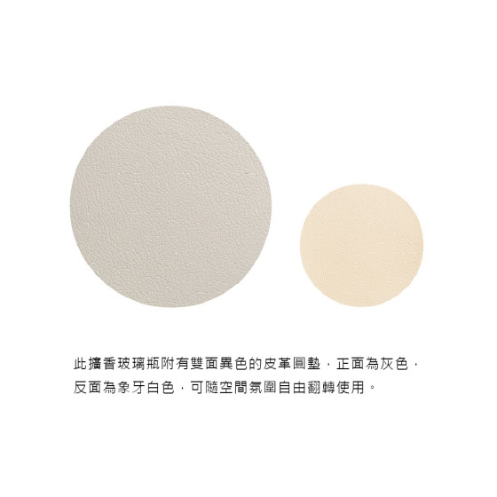 產品內容:香氛精油 250 毫升、錐形玻璃瓶 x 1、皮革圓墊(正面灰色、反面象牙白) x 1、灰色擴香枝 x 5