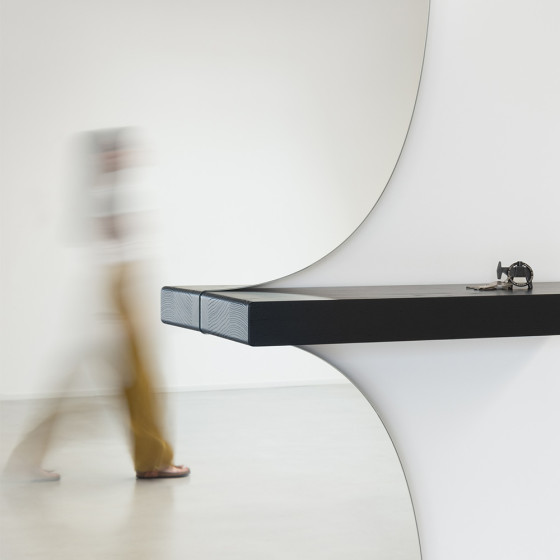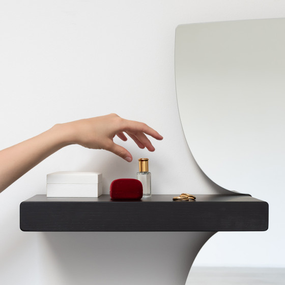 《Morphed Mirror》系列正是這個探索的回應,沒有繁複結構,也不倚賴雕塑般的厚重,而是以最純粹、最簡潔的姿態,將柔軟的形體,凝固於平面與立體之間。有人看見擁抱的弧度、有人看見波浪的推進,也有人看見父母輕扣住孩子臂彎的溫柔,它不僅映照身影,更映照記憶與感受。搭配梣木層板承載日常物件,這件作品就像一個被定格的瞬間,看似靜止,卻在你靠近時,開始呼吸流動。