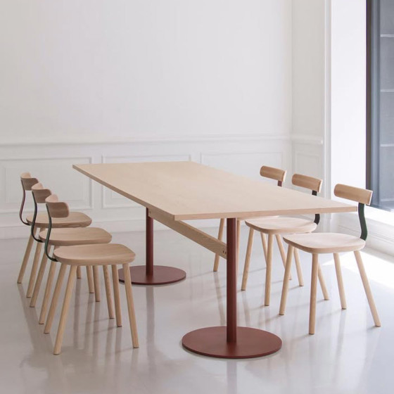 《T&O》系列以堅固木料製成,結合 Maruni 擅長的精密切割技術,打造出輕微彎曲的美麗曲面,T1 Chair 單椅設計靈感源於字母T的形狀,並一改過去全木製家具的既定印象,巧妙結合單支鋼骨作為支撐,漆上黑、綠、紅等三種款式,讓色彩表現更具個性,進一步擴大經典設計的運用,在保有 Maruni 堅守的職人精神前提下,亦為居家及商業空間提供了豐富選擇。