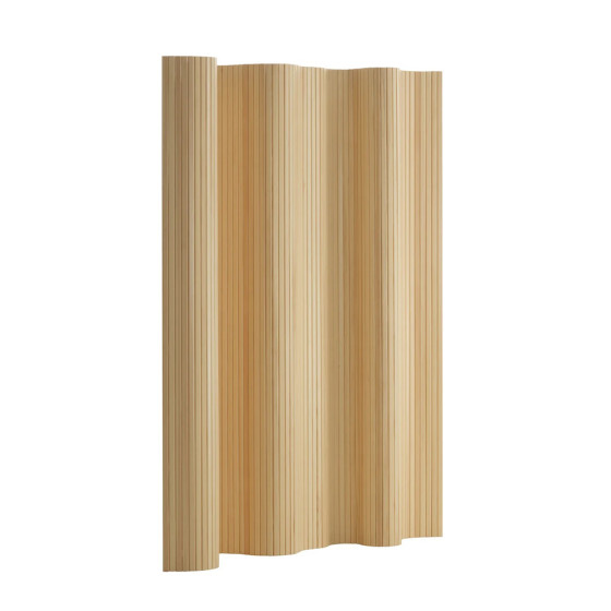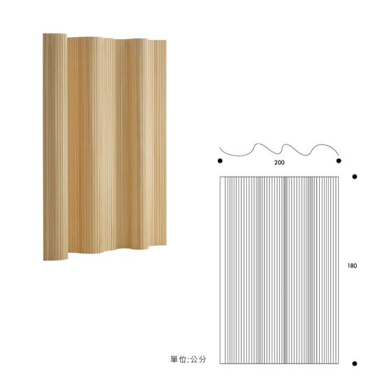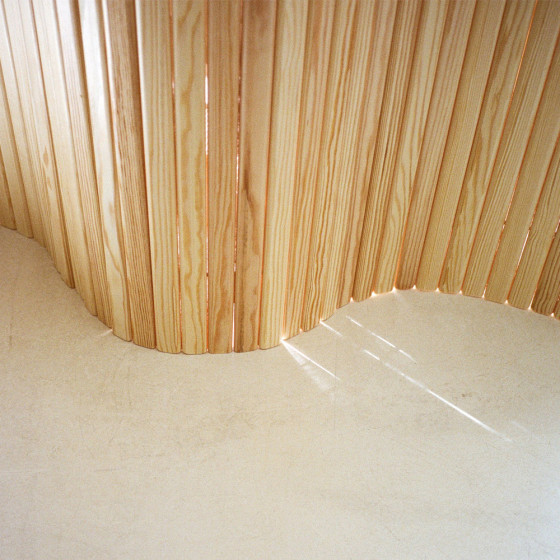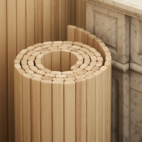 它是由無數垂直排列松木條拼接合組而成,喚起人們對 Aalto 經典建築設計的聯想,就像是維堡圖書館(Viipuri Library)中高低起伏的松木天花板;當多種尺寸一同陳列時,更宛如芬蘭自然景色中連綿的丘陵與湖泊。收納搬運時可捲起節省空間,平整攤開時全長可達 200 公分,每一面細長的木條都可以是關節轉折處,隨心調整適合的弧度,框圍出恬靜風貌的自然場域。