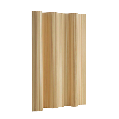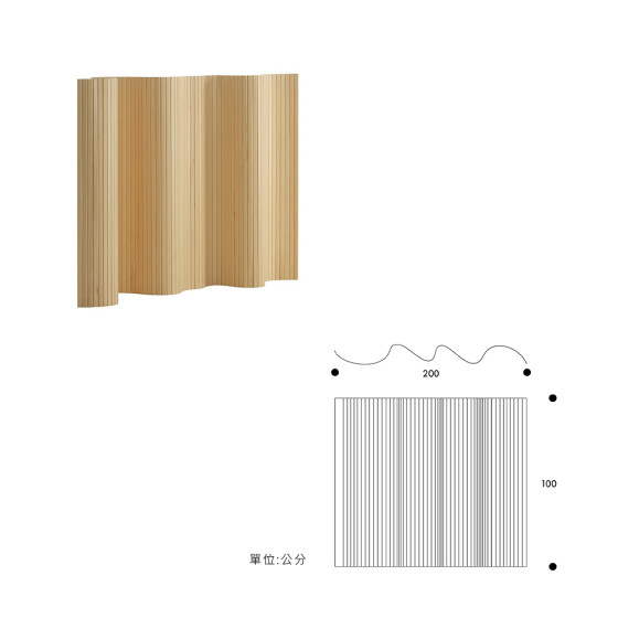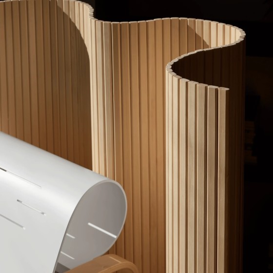 它是由無數垂直排列松木條拼接合組而成,喚起人們對 Aalto 經典建築設計的聯想,就像是維堡圖書館(Viipuri Library)中高低起伏的松木天花板;當多種尺寸一同陳列時,更宛如芬蘭自然景色中連綿的丘陵與湖泊。收納搬運時可捲起節省空間,平整攤開時全長可達 200 公分,每一面細長的木條都可以是關節轉折處,隨心調整適合的弧度,框圍出恬靜風貌的自然場域。