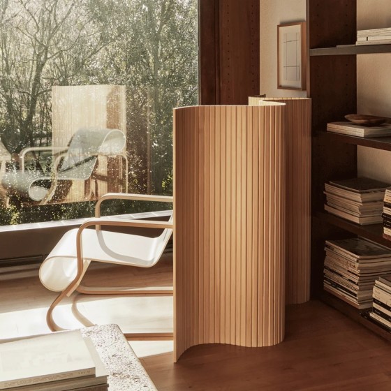 最受歡迎的造型當然首推 Savoy Vase 湖泊花瓶式的擺法,將屏風捏出如芬蘭湖岸線般波紋韻律的圓弧,再讓光線在鵝卵杏黃的木片上調和出天然的深淺明亮與陰暗色塊。
