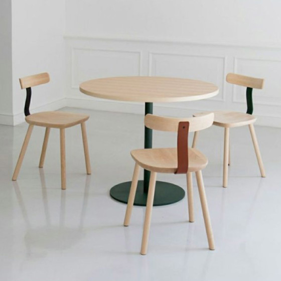 《T&O》系列以堅固木料製成,結合 Maruni 擅長的精密切割技術,打造出輕微彎曲的美麗曲面,並一改過去全木製家具的既定印象,巧妙結合單支鋼骨作為支撐,漆上黑、綠、紅等三種款式,畫龍點睛地讓色彩表現更具個性;在保有 Maruni 堅守的職人精神前提下,亦為居家及商業空間提供了豐富選擇。