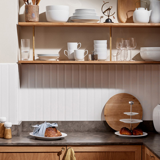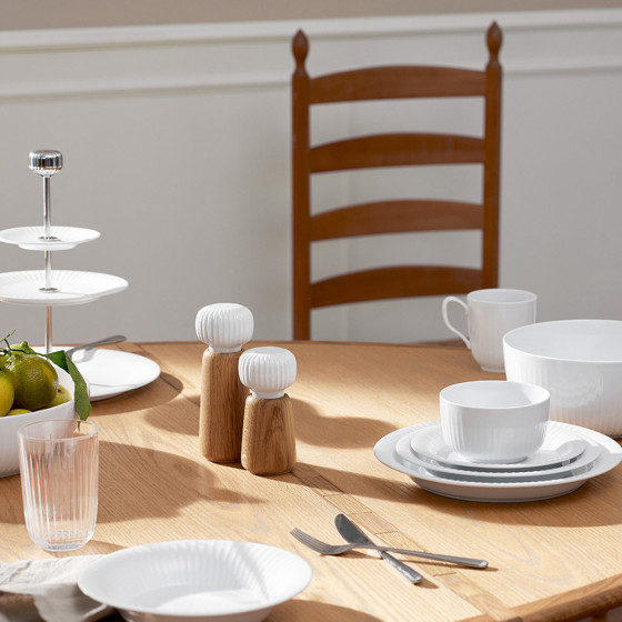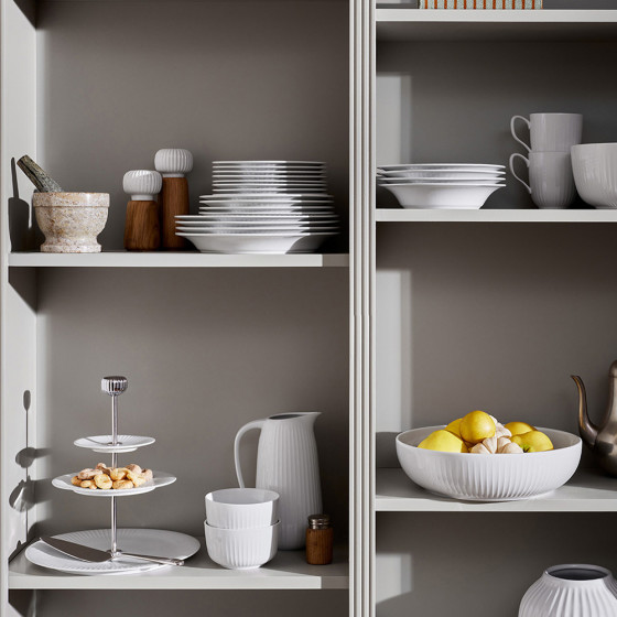 《Hammershøi》系列的設計發想來自藝術家 Svend Hammershøi,為 19 世紀丹麥重要畫家及陶藝家,於 1893 年開始參與 Kähler 的商品設計,推出多款輪廓鮮明、線條強烈的陶藝作品。當代設計師 Hans-Christian Bauer 以此為靈感,將其標誌性的古典紋飾,融合當代設計語彙,轉化為柔和手感的輪花刻紋,2015 年上市推出,便成為最成功的系列之一。