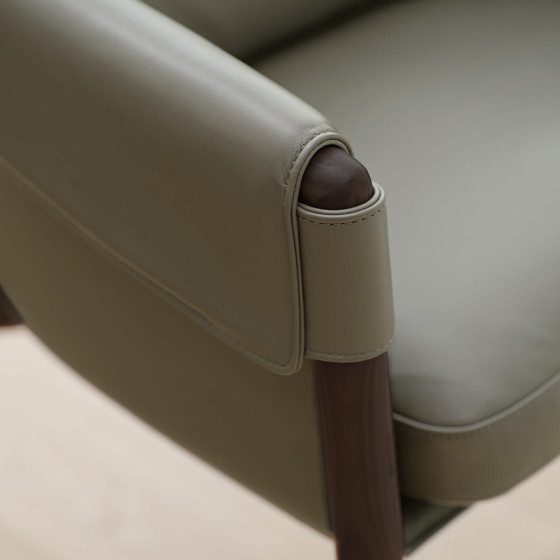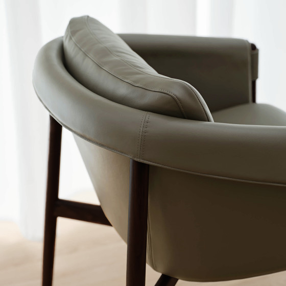 扶手椅椅架選用溫潤奢華的實木,經匠心打磨,天然紋理與層次隨光影流轉;椅型如雕塑般立體卻不失功能,線條優雅俐落,邊角圓潤柔和,低調中散發細膩奢華。椅背以弧線貼合人體,提供溫柔支撐,比例均衡,視覺與觸感皆達和諧,讓這把扶手椅無論置於正式會客、悠閒角落、現代公寓或傳統居室,皆能自然融入,成為空間中的靜謐詩篇。