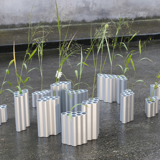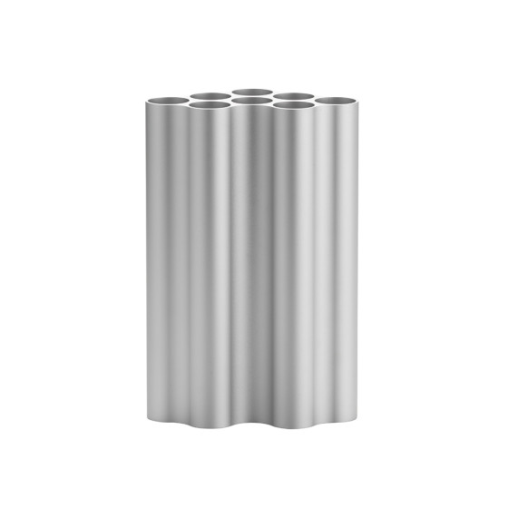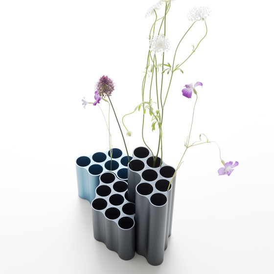 俯視時就像是一朵朵五彩斑斕的雲,以鋁為材質,將花瓶分成了八根獨立的管子,透過陽極氧化處理表面,金屬產生引人入勝的迷幻色澤,在光影下變得溫柔而嫵媚。隨意的插一把鮮花、一根枝條草本或是一片大葉子,根據自己的喜好打造出富有個性的花藝,光在視覺上就令人覺得舒爽不已,在空間享受賞雲最純粹的樂趣。