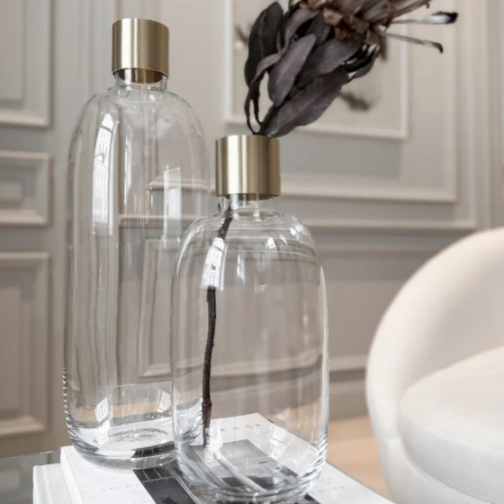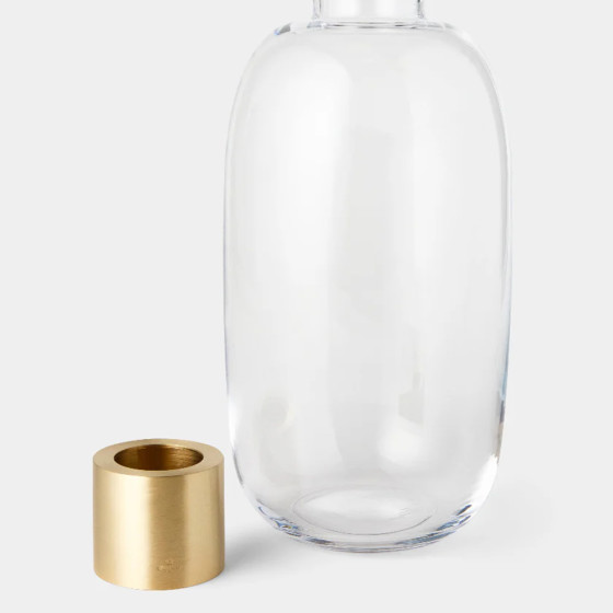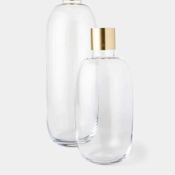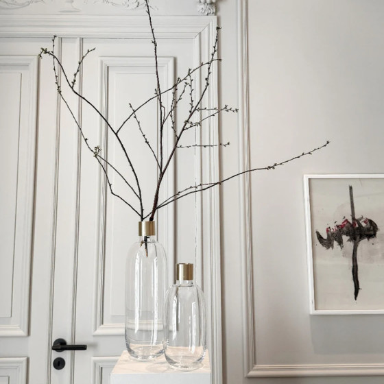 瑞典設計師 Emma Olbers 與 Skultuna 合作的 Damejeanne 玻璃花器,採用灰色和綠色玻璃製成,上部採黃銅製成。它的設計靈感來自法國古老的 Damejeanne 花瓶,是一種大身小頸的玻璃瓶,適合在花器放置單支切花或尤加利葉,形成美麗的古典靜物畫。