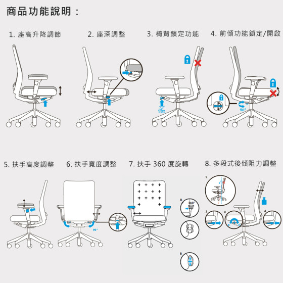 辦公椅調整操作方式請參考影片(點此觀賞)