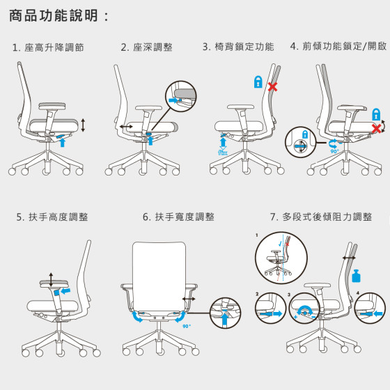 辦公椅調整操作方式請參考影片(點此觀賞)