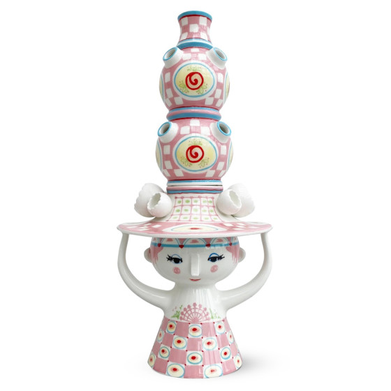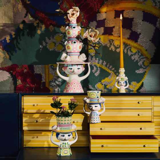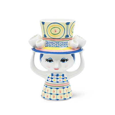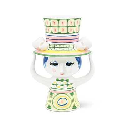 丹麥設計大師 Bjørn Wiinblad 一向鍾情於戴帽人物,在他的設計檔案中,總能看見各式嶄新又充滿玩心的帽子造型。「Lady with Hat」花瓶,帽子如小塔般向上延伸,女子以雙手輕輕扶著;手繪裙身的幾何圖形,搭配帽子上的格紋細節,形成輕巧而優雅的對比,散發出富含想像力的奇幻氛圍。