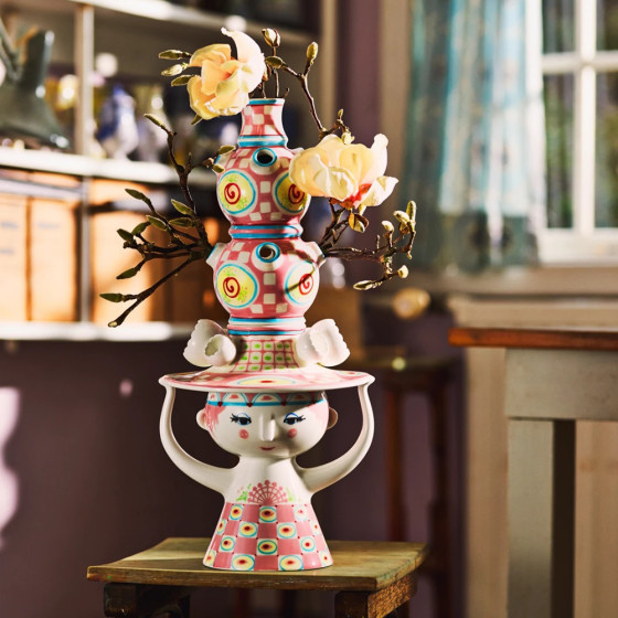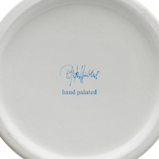 這款花瓶高度達 50 公分,它是由兩個獨立的花瓶所組成,既可合而為一,也能分開使用。基座為標誌性的手繪臉龐,雙臂托舉著巨大帽子,帽緣兩側點綴可愛的陶瓷鬱金香,它可擺放於玄關迎接賓客,或是餐櫃、窗邊、桌面上的視覺焦點,成為空間中華麗而難忘的存在。而花瓶底部可見 Bjørn Wiinblad 的原始簽名與手繪標記,證明這是一件獨一無二的設計經典。