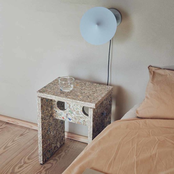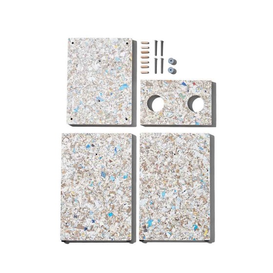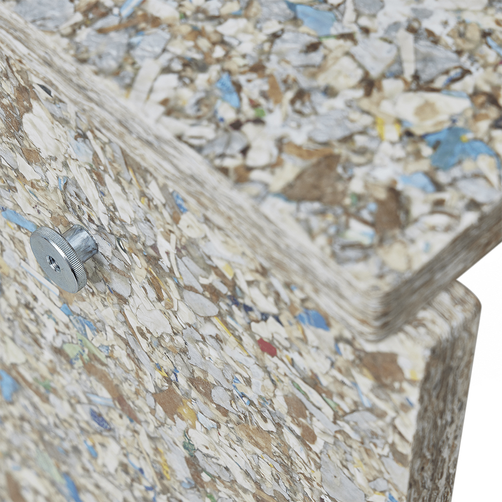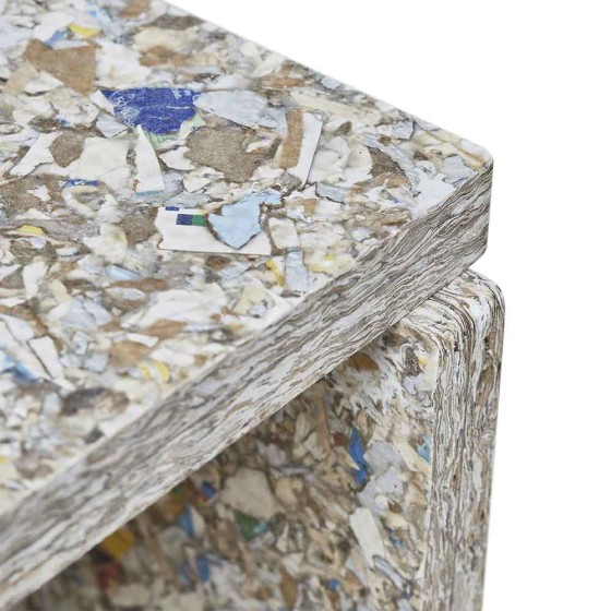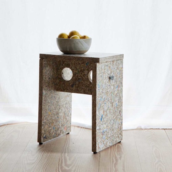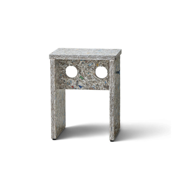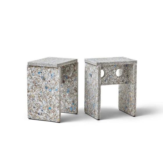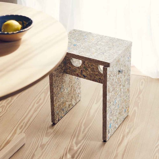 Remake Stool 採用瑞典回收材料公司 Recoma 所開發的創新永續材料 Pack Wall Design Board,以回收飲料紙盒再製而成。製程中循環利用了 約 7,000,000 公斤原本將被焚化處理的包裝廢棄物,讓紙、塑膠與鋁得以被重新使用,減少近 5,000 公噸的二氧化碳排放,為家具材質提供更具永續的替代方案。