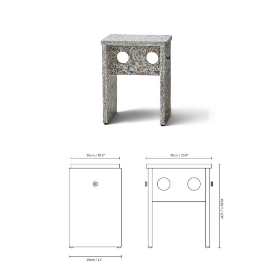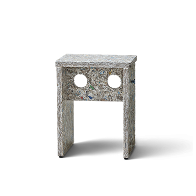 「以回收材料作為創作材料,本身即充滿趣味。它的表面與邊緣皆呈現一致質地,使凳子在視覺上宛如一件完整雕塑品。正如天然木材般,材質的特性讓每件作品在外觀上皆有差異,也使每一張凳子都成為獨一無二的存在。」- Herman Studio 丹麥設計團隊