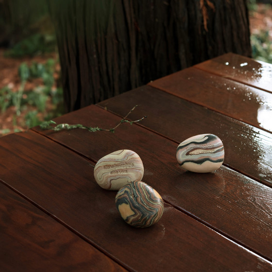 每一顆鵝卵石磨砂皂,皆不倚賴模具,全程以雙手塑形,由品牌皂藝師以掌心反覆揉塑,使外型自然圓潤,貼合手感,也讓香氣得以恰如其分地釋放只為呈現最純淨自然的色澤與質感。這門工藝仰賴時間、直覺與對草本原料的深刻理解,確保每一塊肥皂在外型、觸感、起泡性與潔淨力之間,皆達到理想平衡。