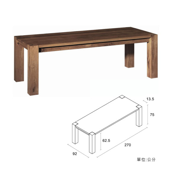 桌子尺寸:長 270 公分 x 寬/深 92 公分 x 高 75 公分