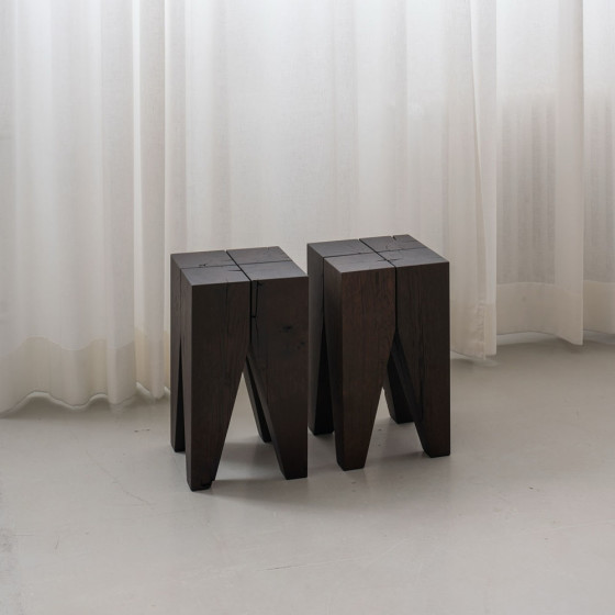 Backenzahn™ 臼齒小木桌和臼齒木凳的差別在於木凳的表面有微微的曲面加工,適合當作椅凳使用,而小木桌則是平整表面,更適合用來當作邊桌置物。