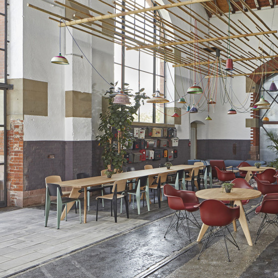 說到餐椅,在 Vitra 眾多經典名椅中,有一張由法國建築大師 Jean Prouve 於30年代推出,看似中庸平凡,事實上蘊含的設計語彙經典而豐富,足以稱為椅界標準的──Standard Chair。這款80年來不敗的經典餐椅有多威呢,有一個小故事可以說:幾年前連鎖速食業麥當勞想在羅浮宮隔壁開新店,結果惹來全國一片罵聲,為了平息法國人驕傲的怒火,麥當勞就在整間門市使用了 Jean Prouve 當餐椅,可能想說只要在美麗的椅子上用餐,永遠拿不到星的速食也能吃得優雅吃得美,就算是刁鑽的法國人也該妥協吧!