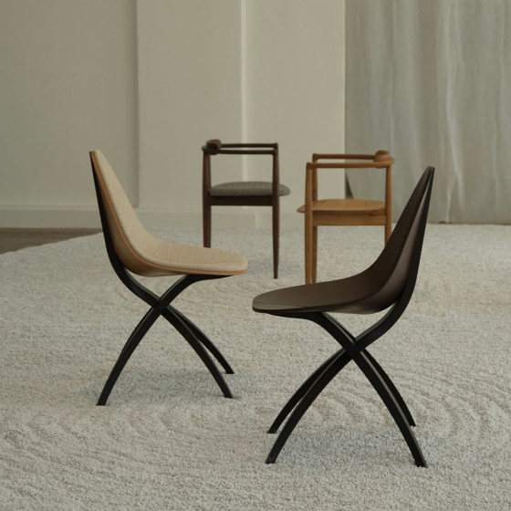 GamFratesi 設計團隊希望打造一種如枝幹般溫柔支撐的結構,輕巧地托起懸浮的座面,彷彿葉片自然依附於枝頭。整體以木質為主要材質,透過不同的加工方式與工藝技法,讓工業化製程之中依然保有自然的紋理與生命感,展現自然之美與結構張力的平衡。