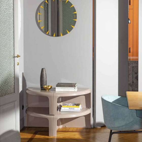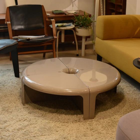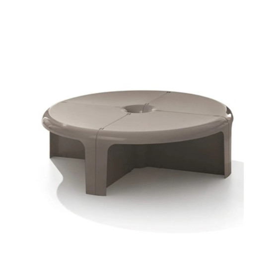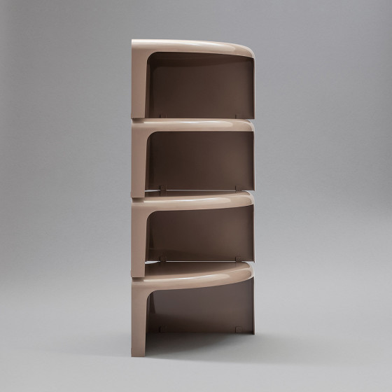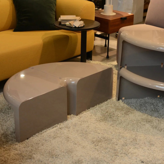 由四個獨立單元構成,透過流暢的曲線語彙、亮面塑料質感與簡易的嵌合結構,可自由組構為圓形茶几、蛇形桌,亦可延伸轉化為模組書架或轉角層架,展現高度靈活的組合邏輯。作品採用 ABS 塑料射出成型製作,輕巧而耐用,無論居家空間、書房或等候區皆適用。對於設計愛好者而言,《4/4》亦曾於 007 電影《鑽石大作戰》中登場,為其經典地位再添一筆文化印記。
