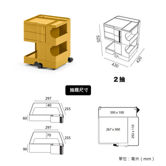 Boby 滾輪置物櫃(蜂蜜黃、中、2 抽屜)