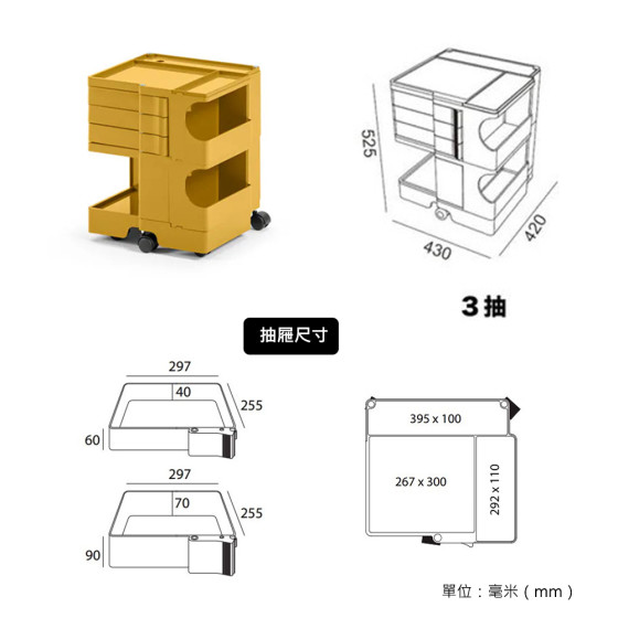 Boby 滾輪置物櫃(蜂蜜黃、中、3 抽屜)