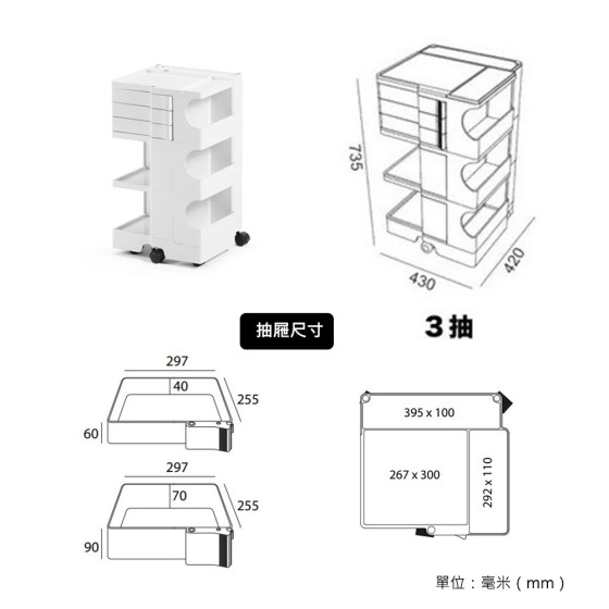 -三抽抽屜:長 29.7 x 寬 25.5 x 高 4(公分)