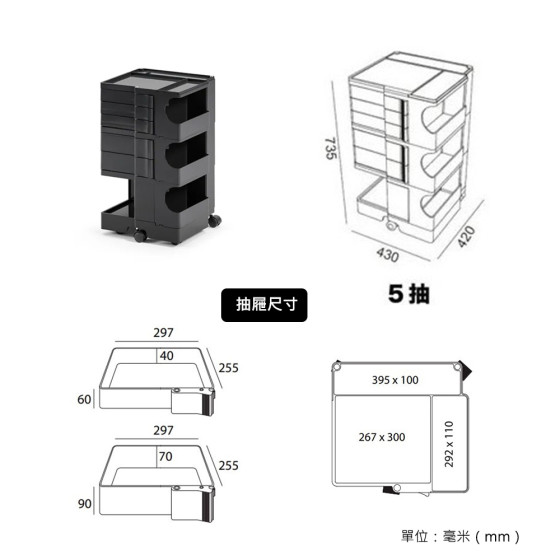 Boby 滾輪置物櫃(瑪瑙黑、高、5 抽屜)