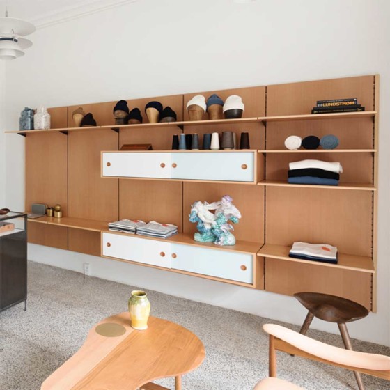 Finn Juhl 於 1953 年設計出 Panel System 壁掛層架系統,並於 2013 年重新推出壁櫃組合。此系統採用模組化設計,櫃體與層板皆可依需求自由調整位置,展現高度靈活性,同時可透過多種木料材質、色彩與收納櫃的搭配組合,組合出近乎無限的配置可能,在形式與機能間取得恰到好處的平衡,是一套經典現代且具靈活性的動態收納方案。