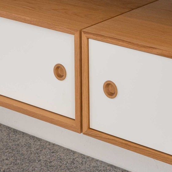 Finn Juhl 於 1953 年設計出 Panel System 壁掛層架系統,並於 2013 年重新推出壁櫃組合。此系統採用模組化設計,櫃體與層板皆可依需求自由調整位置,展現高度靈活性,同時可透過多種木料材質、色彩與收納櫃的搭配組合,組合出近乎無限的配置可能,在形式與機能間取得恰到好處的平衡,是一套經典現代且具靈活性的動態收納方案。