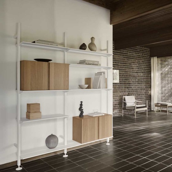 Pira G2 的設計核心在立柱(pole)設計,包含三種安裝形式:壁掛固定 Wall mounted、壁掛 +天花板固定(需靠牆)Wall-ceiling mounted、落地+天花板固定(無須靠牆)Floor-ceiling mounted,使得層架得以實現由地面延伸至天花板的站立支撐。層板沿立柱串聯排列,彼此緊密連結,呈現出宛若一體成形姿態。即便為模組化設計,組裝完成後卻幾乎不見接縫,成為純粹而完整的視覺存在。