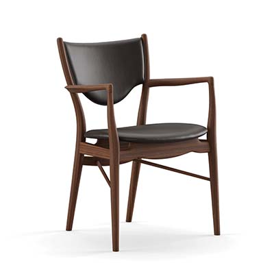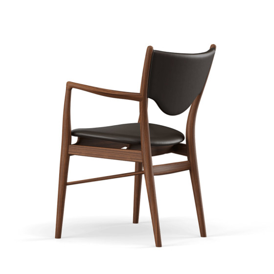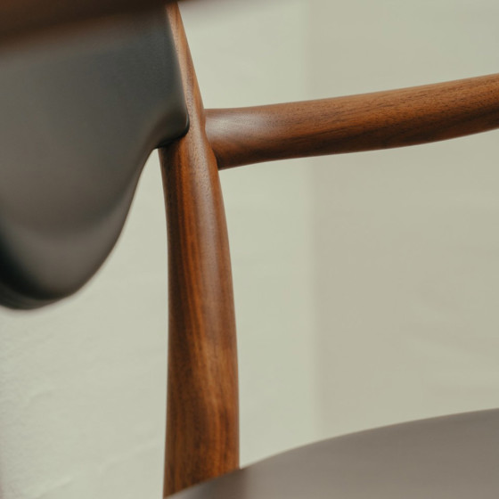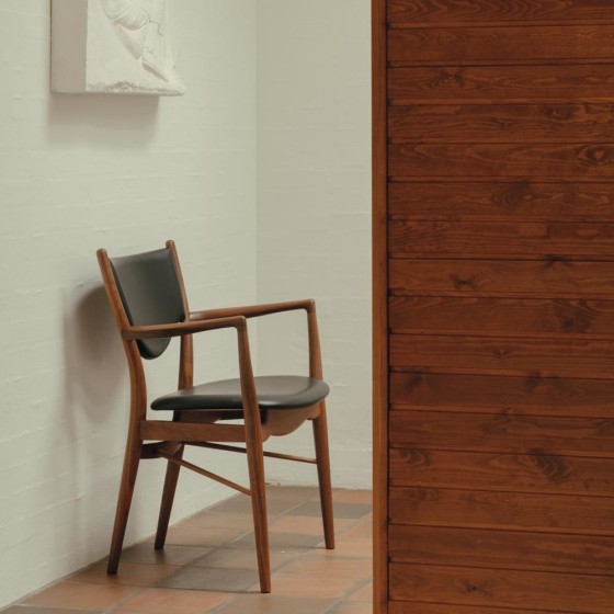 46 號椅最初為 Finn Juhl 與工匠 Niels Vodder 繼聲名大噪的 45 號椅後於 1946 年匠師協會展中推出的新作,並在 1953 年與家具製造商 Bovirke 製作了扶手椅的版本。延續 45 號椅視覺飄浮的清透感,46 號椅在座椅的木架與坐墊間插入支架,讓軟墊脫離框架產生乘、坐分離的效果,這在視覺上創造出有別以往的特殊效果,營造輕盈無重力的形式。而底部呈現三角線條的兩枝支柱,均勻分散乘坐壓力,因此在各部位完全被切開的情況下,卻依然穩固又輕巧的像漂浮於宇宙之間。而椅墊也相當講究地使用天然皮革,除了保留了動物最完整的皮膚紋理,擁有舒適觸感和天然表面,更可說是一種有生命力的皮革。