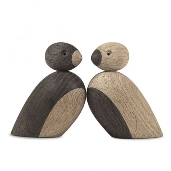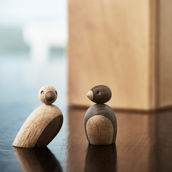 可愛無邪、個性溫順的鳥兒,雙雙對對地一起出現,彼此理毛、餵食以及分享枝巢。牠們眼裡閃爍著幽默、純真的工藝幻燈片,身子則是特別選用了天然實心橡木製作。清晰的花紋豐滿了羽裳,而這些花紋較深的部分是經過木材脫水後所煙燻上的淺淺蜜糖色,既不掩飾木材本色,也簡單地識別出木頭對鳥那色澤相反的身影。無論它們是在床頭櫃前相依偎,或雙雙佇立於窗台上,你都可藉由頸部的可轉式卡榫,以凝視對望或撇轉過頭,輕輕地透露出你的情緒微語。