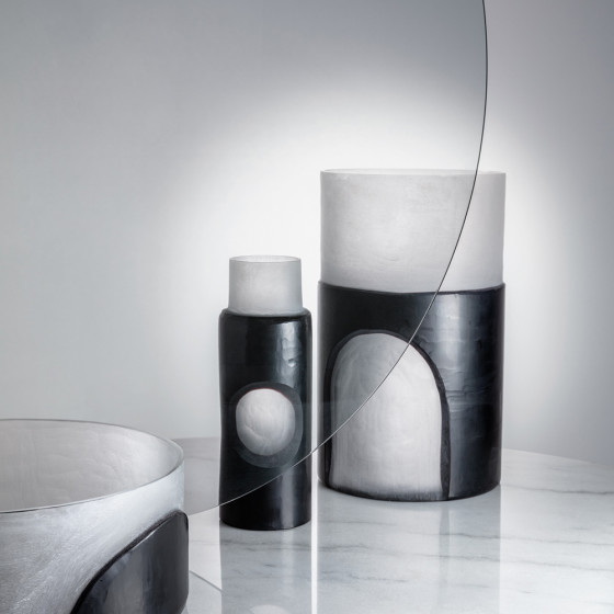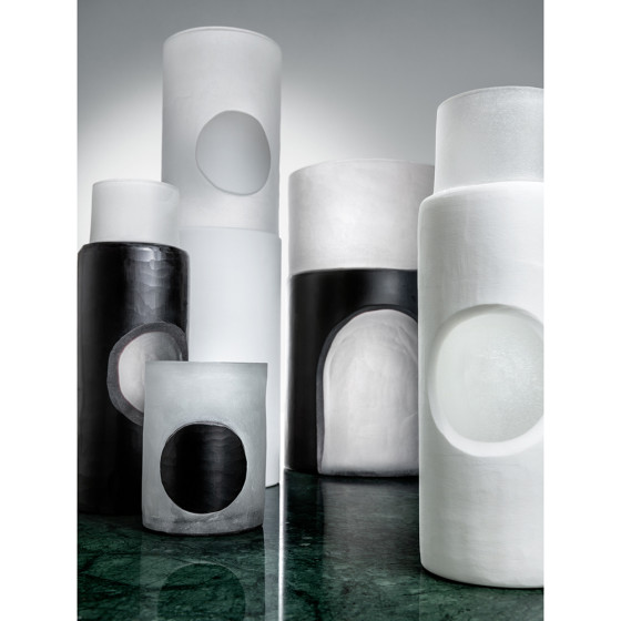 「這是極具吸引力的挑戰!玻璃是一種富有生命力,甚至具有記憶力的材質,高溫熔化後其流動的方式如同濃稠的蜂蜜般,難以將它雕塑成為精準的幾何線條,一個不小心吹壞了便難以回復。」Carved 簡潔的線性輪廓上精心雕刻出半透玻璃層,呈現出如水彩、潑墨畫的色澤,在光影照耀下更顯空靈的優雅質感,不論是當桌飾,或擺放花朵都會是居家擺設中的亮點!