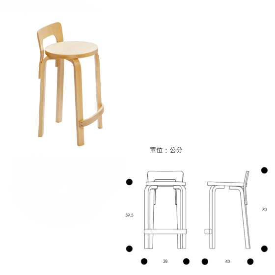 熱愛自然素材的 Avar Aalto,每一件的家具作品幾乎都以芬蘭盛產的白樺木作為主要選材,對他而言,木料呈現出的天然紋理及溫暖色澤,是製作傢俱不可多得的絕佳材料。在當年,已嘗試製作許多曲木傢俱的他,希望能製作一張恰到好處的完美高腳椅,讓傢俱的在日常的使用及習慣,能有更多的彈性與機能。
