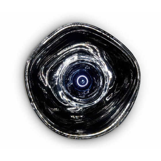 關燈的時候是一顆顆不透明的金屬球,工業摩登的風格是我們所習慣的 Tom Dixon 形象。但是開燈的霎那金球就彷彿被扭曲成異空間,天花板平白開了道時空裂縫,只見眾人驚呼連連,眼底光芒妙不可言。