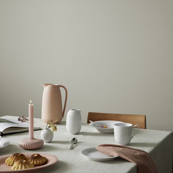 Hammershøi 系列的設計發想來自藝術家 Svend Hammershøi,為 19 世紀丹麥重要畫家及陶藝家,於 1893 年開始參與 Kähler 的商品設計,推出多款輪廓鮮明、線條強烈的陶藝作品。當代設計師 Hans-Christian Bauer 以此為靈感,將其標誌性的古典紋飾,融合當代設計語彙,轉化為柔和手感的輪花刻紋,2015 年上市推出,便成為最成功的系列之一。