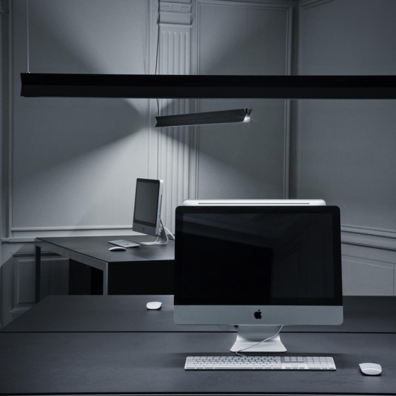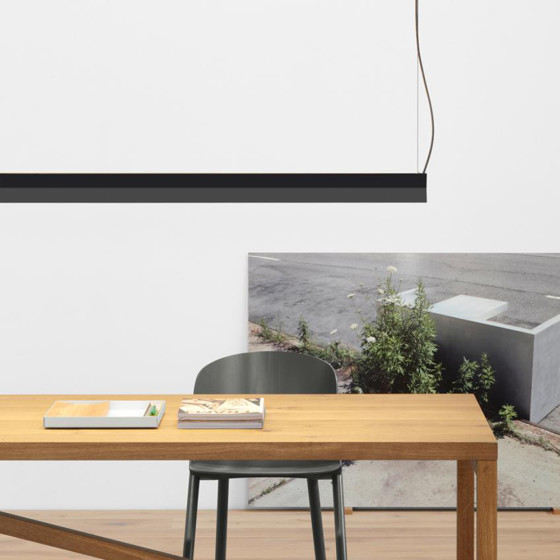 懸掛半空中的 Span 橫式吊燈,於兩點一線間取得巧妙平衡,完美橫跨於室內空間的俐落直線,其橫式燈罩外觀只有 8 公分高,輕薄如羽,讓人不禁忽略它作為「燈」的照明存在,如自然光源般融入周遭,沉浸其中,令人察覺不出,但其實它一直都在。