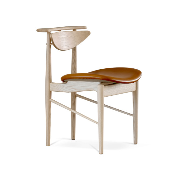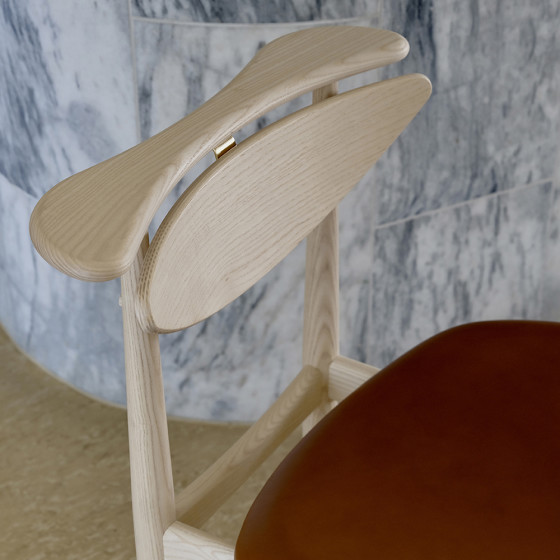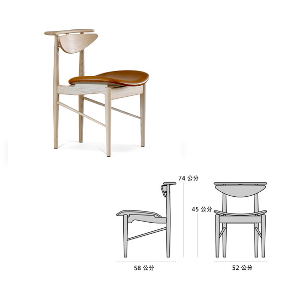 雖然精簡了結構,但別以為他就此放下藝術堅持。除了以懸架保持椅背間隙讓單椅看起來輕盈,從側面觀看更才發現刻意被突起的座架,將曲面座墊騰空架起;若自一般視角看,座墊令人有一種漂浮的錯覺,展現出 Finn Juhl 出色的前衛實驗特質。