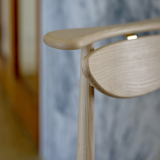 Finn Juhl 自椅背向後延伸出一片宛若骨幹的水平橫框,這是為了讓乘坐者在轉身時手臂擁有更多擺放角度,甚至直接反坐並將手舒服地架著,也使得這件充滿有機形態的閱讀椅,更為優雅無比。