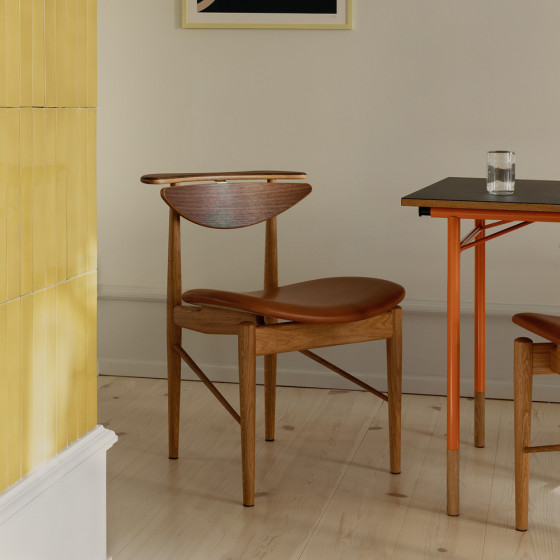 雖然精簡了結構,但別以為他就此放下藝術堅持。除了以懸架保持椅背間隙讓單椅看起來輕盈,從側面觀看更才發現刻意被突起的座架,將曲面座墊騰空架起;若自一般視角看,座墊令人有一種漂浮的錯覺,展現出 Finn Juhl 出色的前衛實驗特質。