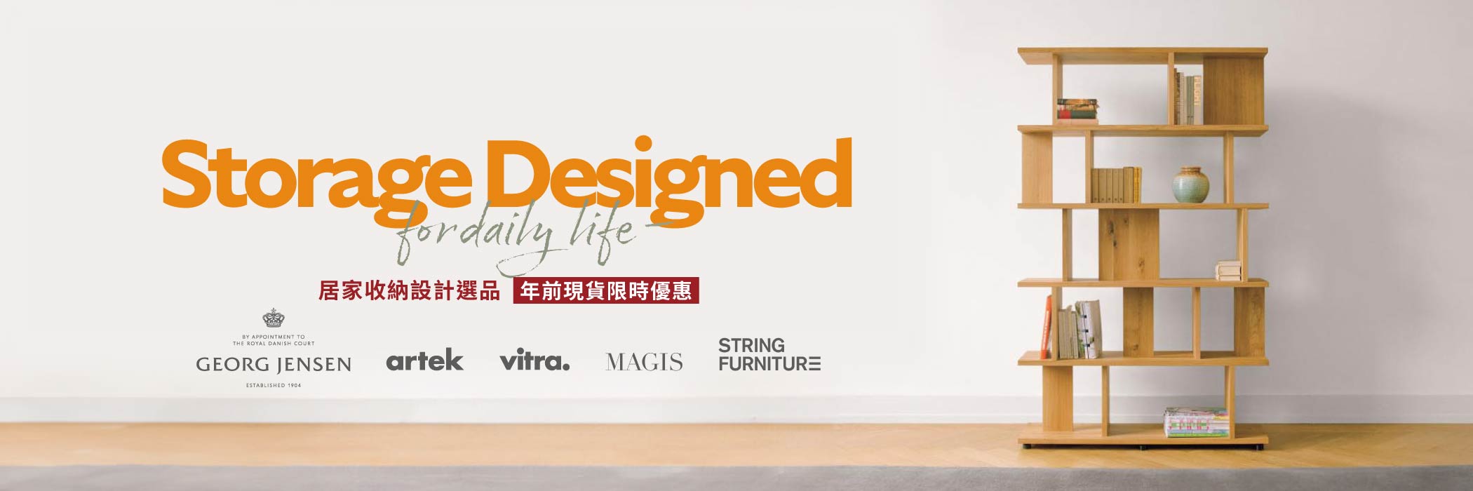 精選多款國際設計品牌,涵蓋芬蘭國寶家具 Artek、Vitra 桌上與居家收納設計、義大利前衛家具品牌 Magis、丹麥經典銀器與家飾品牌 Georg Jensen,以及重視環境永續的瑞典收納系統 String。